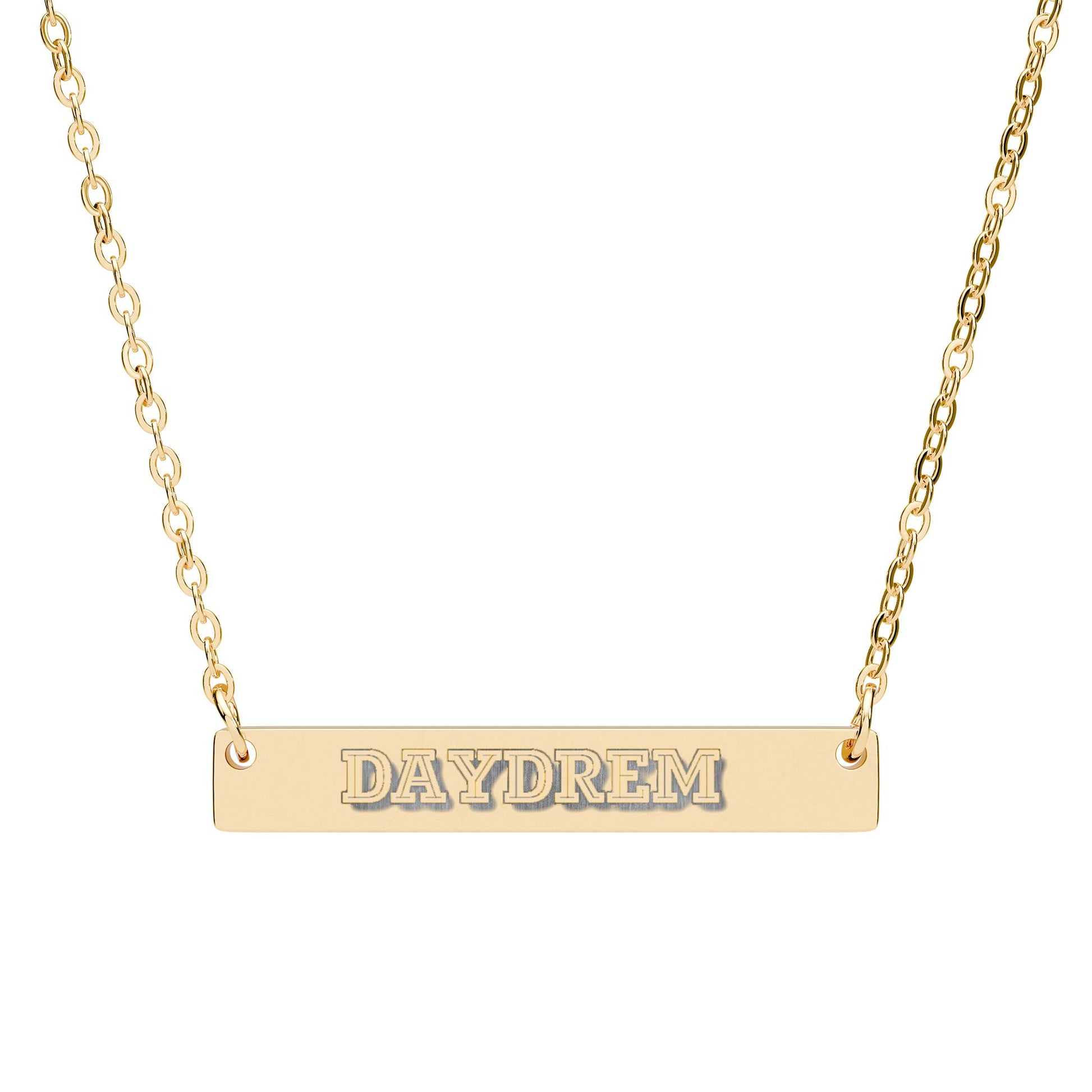 A slim, engraved horizontal bar necklace that reads like a quiet declaration. Lightweight and low-profile, it settles against the collarbone and catches the light with its PVD-finished surface. The laser-etched letters are permanent, leaving a crisp, slightly industrial imprint that ages without losing character. Wear it alone for a subtle statement or layer it with longer chains for an intentional, curated look. It’s made to be worn every day — from morning coffee runs to late-night city walks — carrying a small, personal message with you wherever you go.