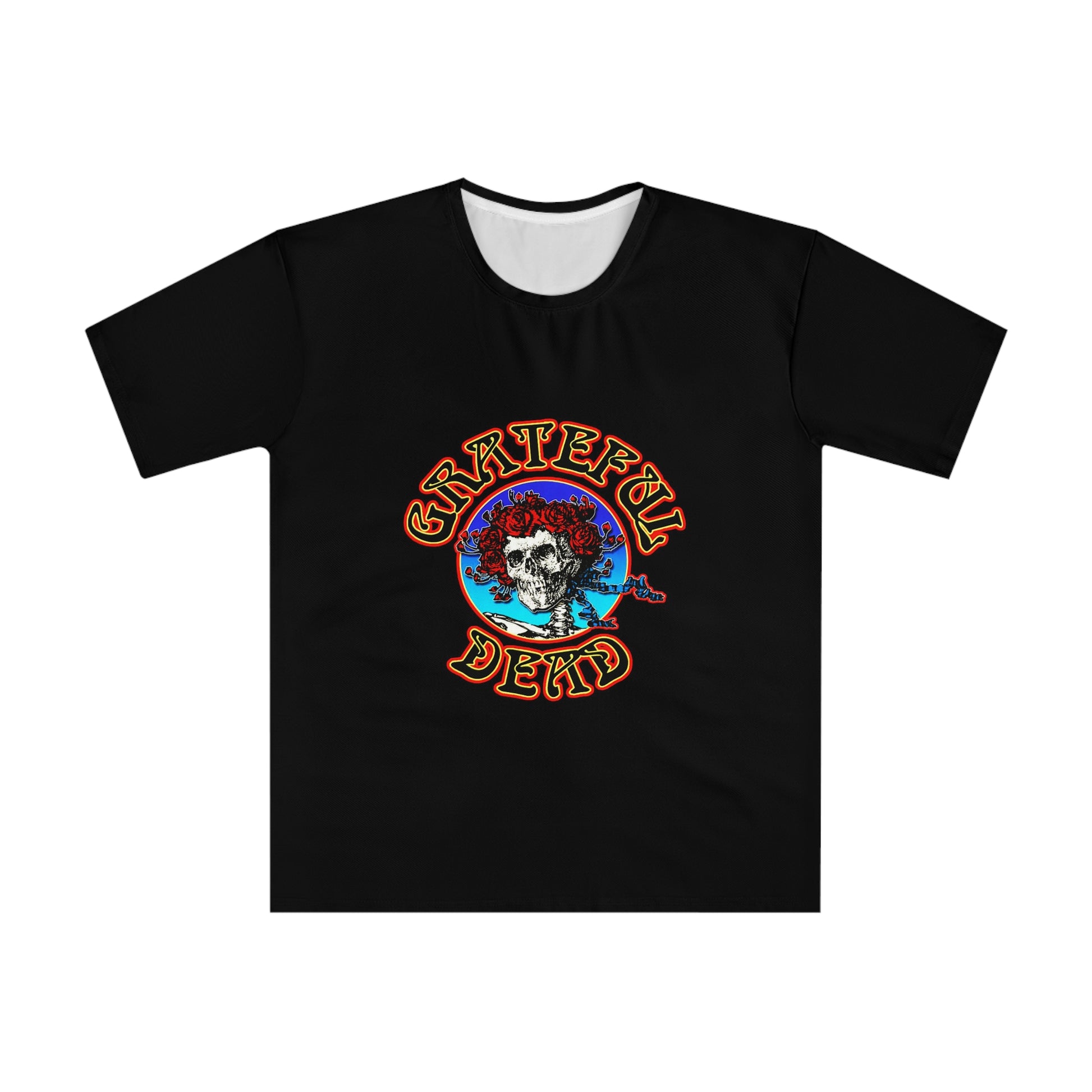 A laid-back black tee that channels vintage concert energy. The front shows a colorful, slightly worn Grateful Dead-inspired skull and roses motif framed by retro lettering — a nostalgic nod to road trips, late-night shows, and the sticky-sweet thrill of live music. Lightweight and drapey, it moves easily through summer evenings and layered fall looks. Wear it to backyard shows, vinyl listening sessions, or on long drives where the windows are down and the playlist never ends. The relaxed cut keeps the focus on the art, while the breathable poly-spandex knit keeps you cool and comfortable through the encore.