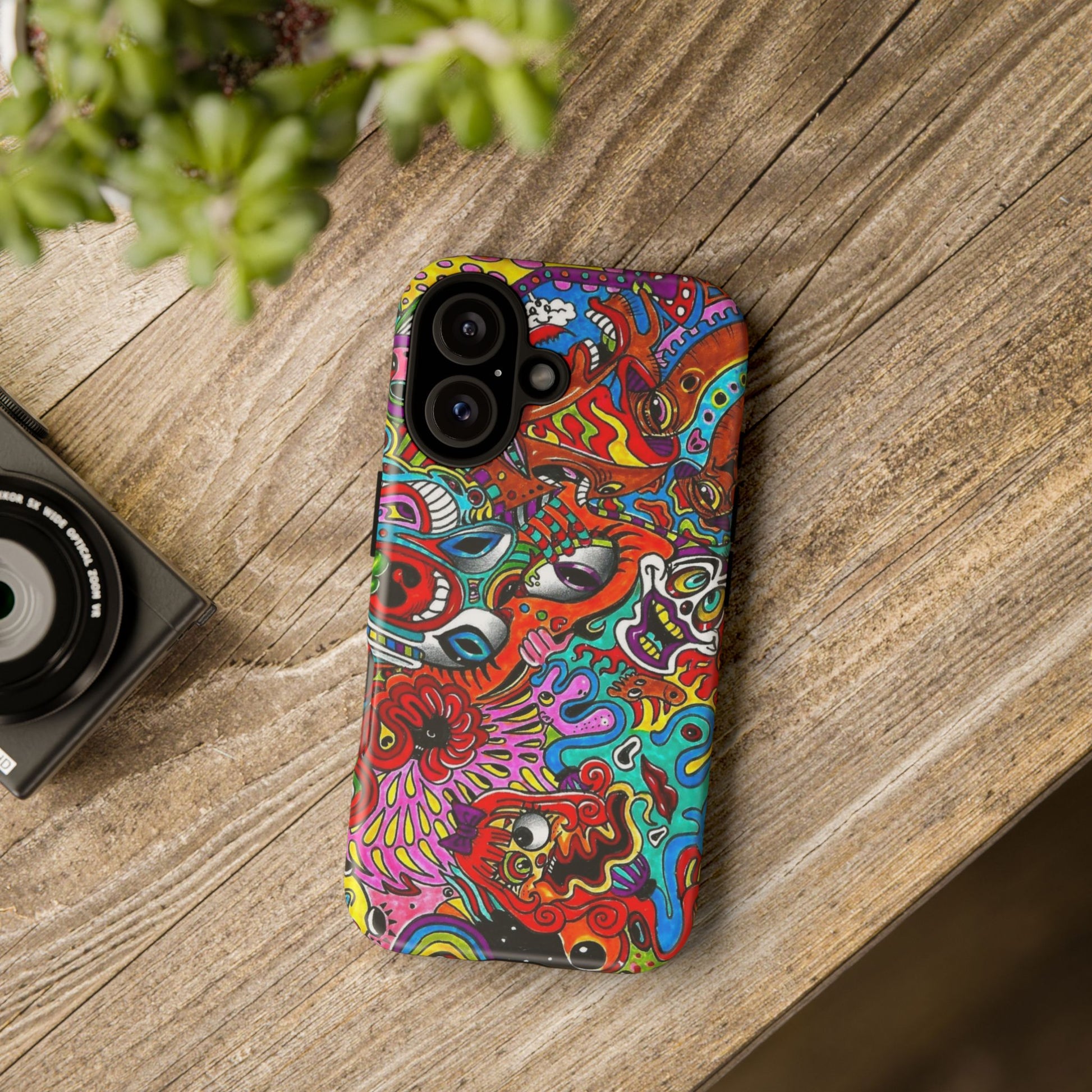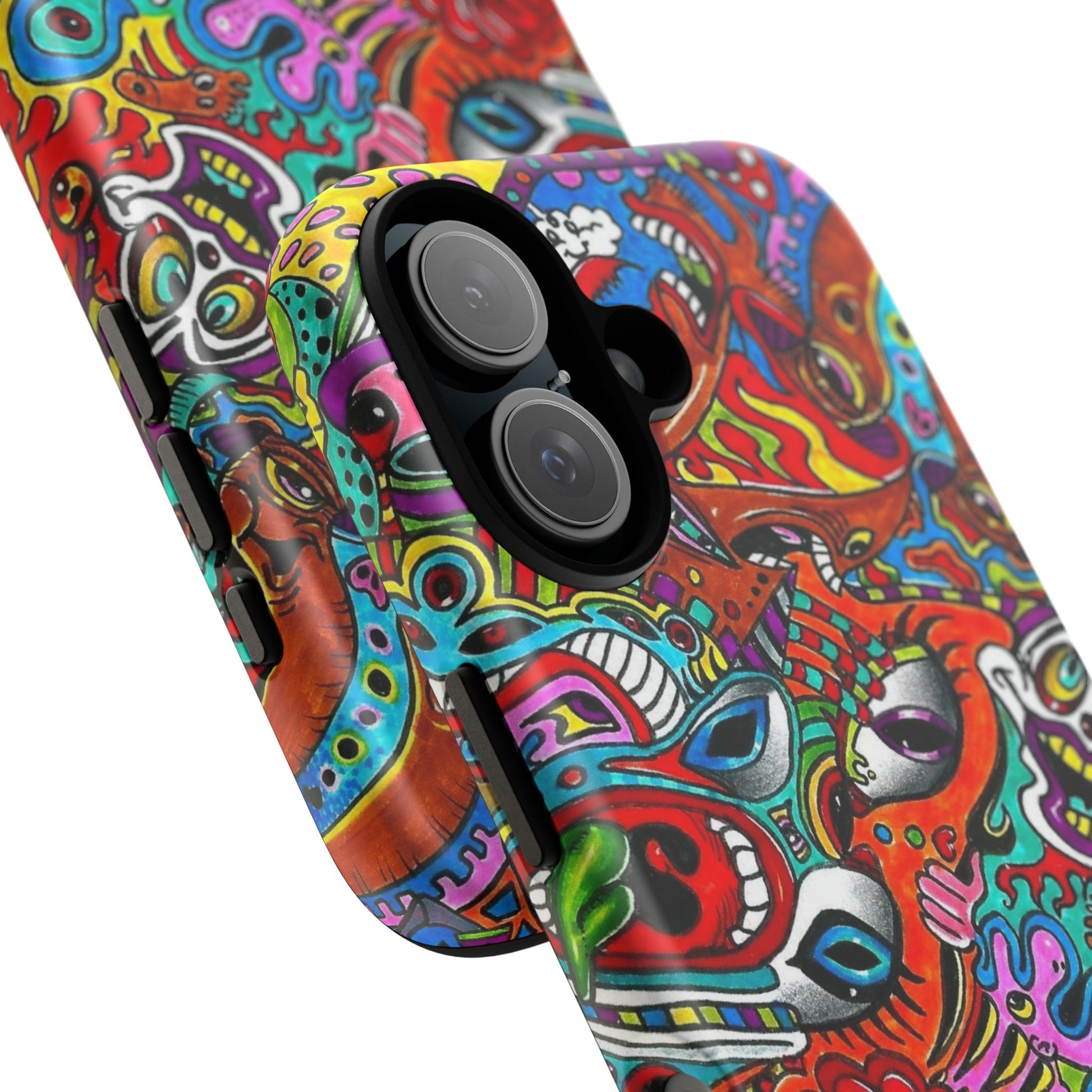 This vivid protective case turns your phone into a moving piece of street-art: layers of hand-drawn characters, swirling colors, and bold linework wrap across the shell in a striking 3D-print finish. It feels lively in hand and confident in style — the glossy/matte options keep the artwork sharp while a soft TPU liner cushions drops. For people who live loud and carry art with them, this case keeps the phone safe from everyday knocks and weathered UV exposure without hiding the design’s personality.